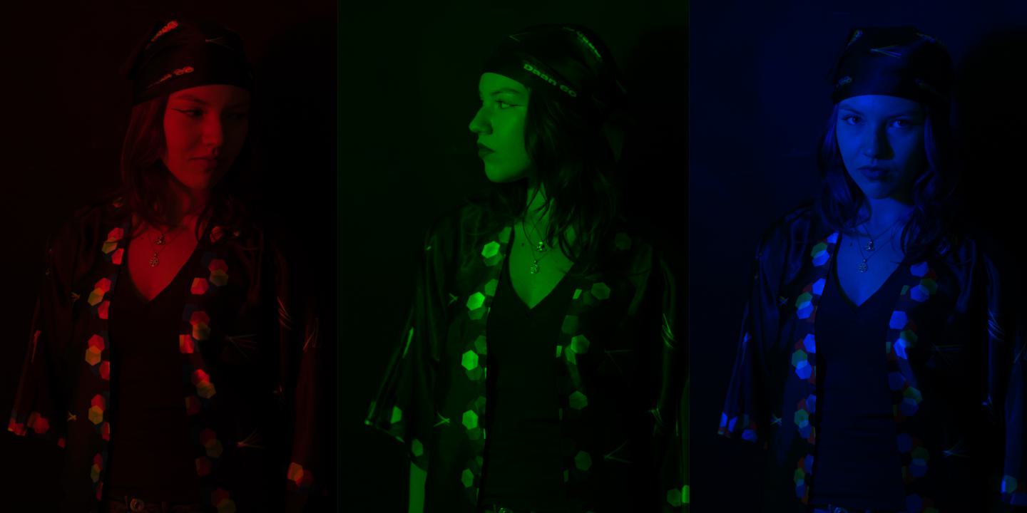 In this fashion experience, pattern design, textile technologies and colour theory come together to create dynamic interactions with RGB light. Using specific patterns and colours on a black base, the prints appear to shift or move under coloured lighting. These effects are not digitally rendered but emerge through the relationship between garment, space, and light.