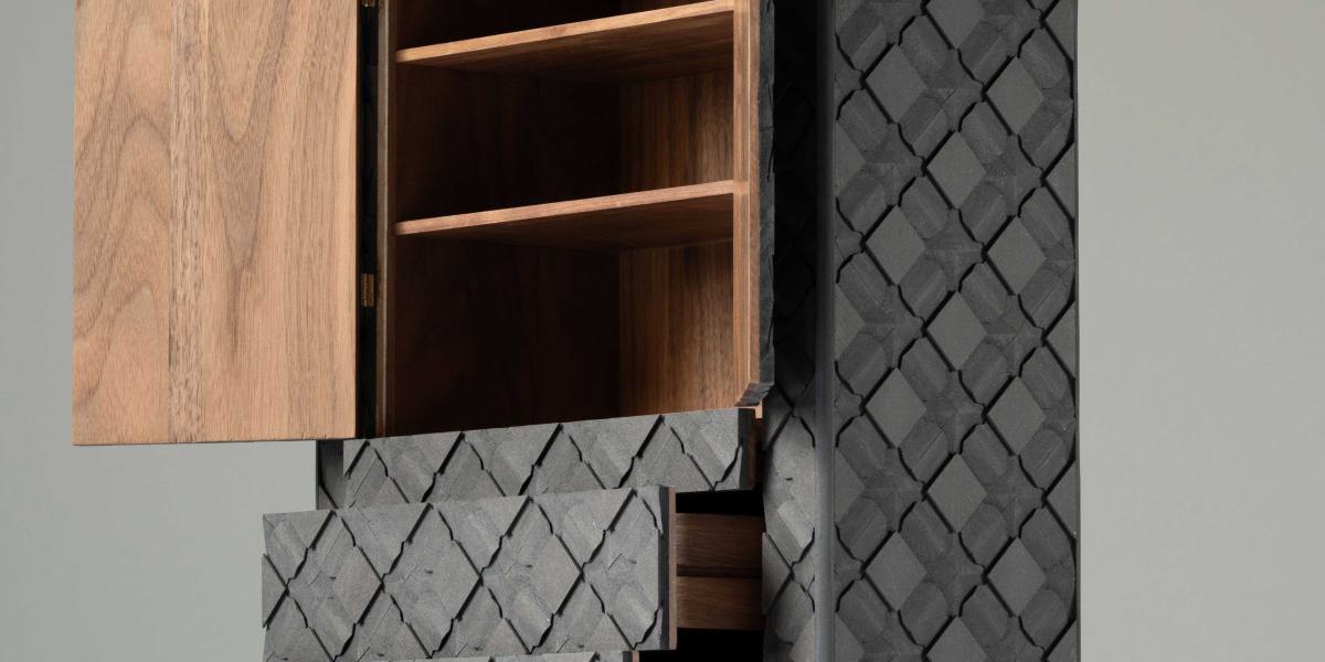 The cabinet is composed of three integrated elements: the patterned outer facade, the precisely built inner carcass, and the refined walnut interior. The exterior comprises 260 handcrafted blocks forming a continuous “origami skin.” While this "skin" might look automated, there are no computers involved; each block is made by hand using a self-developed sawing technique. The interior, minimal yet refined, mirrors the attention to detail of the exterior. Together these elements transform a functional object into a study of illusion, precision, and the enduring relevance of the handmade.