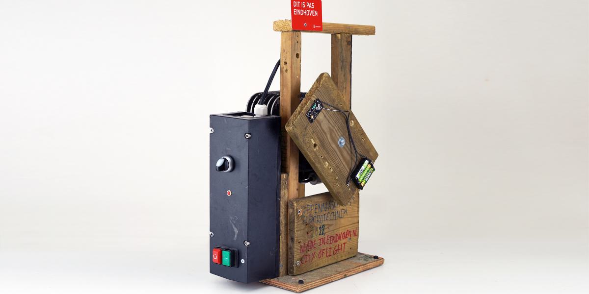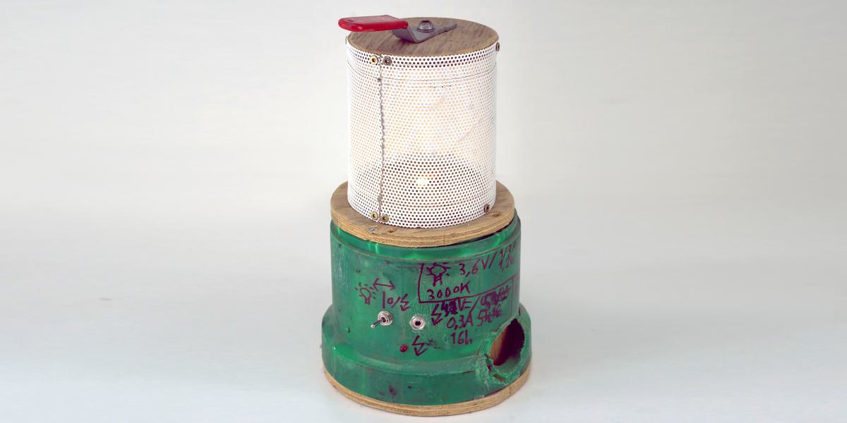 Stijn Op de Macks (born 1993) is an unmistakably authentic designer. Born and raised in Eindhoven, he continues the city's tradition of electrical innovation in his own unique way. Operating under the name Uppenmasch AG Elektrotechnik, he creates lamps, amplifiers, power banks, fans, light organs and paper shredders, making use of found and reusable materials wherever possible.