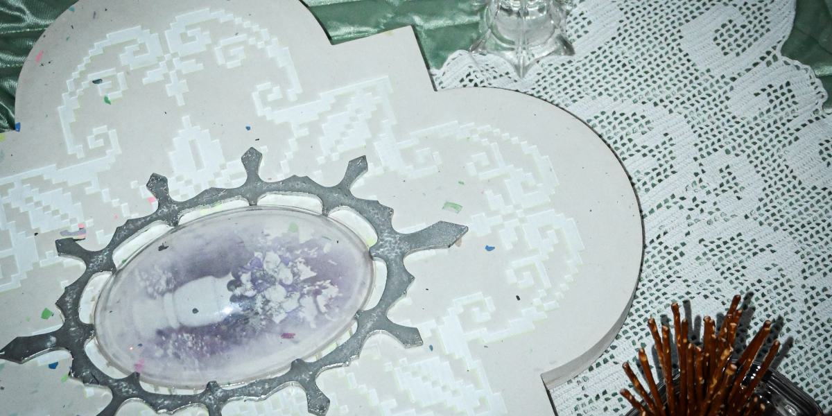 A place full of color, detail, and symbolism. What particularly struck me was how much attention the people from the village gave to the artificial flowers in the cemetery. Unfortunately, in the meantime the municipality has chosen to clear the cemetery. I quickly connected this fact to the clearing of my mother's grave a year ago. That's why I wanted to create objects with the same attention as the villagers gave. In doing so, incorporate photos and crochet patterns. Layer by layer, I engrave the work and fill it with plaster, like an erosion of time.