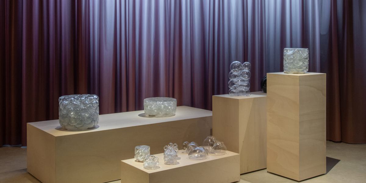 In Bubbled Matter at Kazerne, air is made visible by capturing exhaled breath in glass, which are then stacked to form a collection of coffee tables.