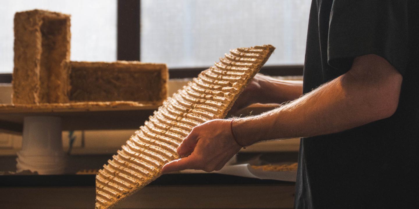 With this new composite, we created modular and layered, carbon storing, elements that combine sound absorption and design, adding warmth, texture and circularity to interior spaces. This breakthrough not only diverts agricultural residues from waste streams but also opens a pathway to functional, scalable, and sustainable materials demonstrating that regenerative design can start from the overlooked parts of our food system.