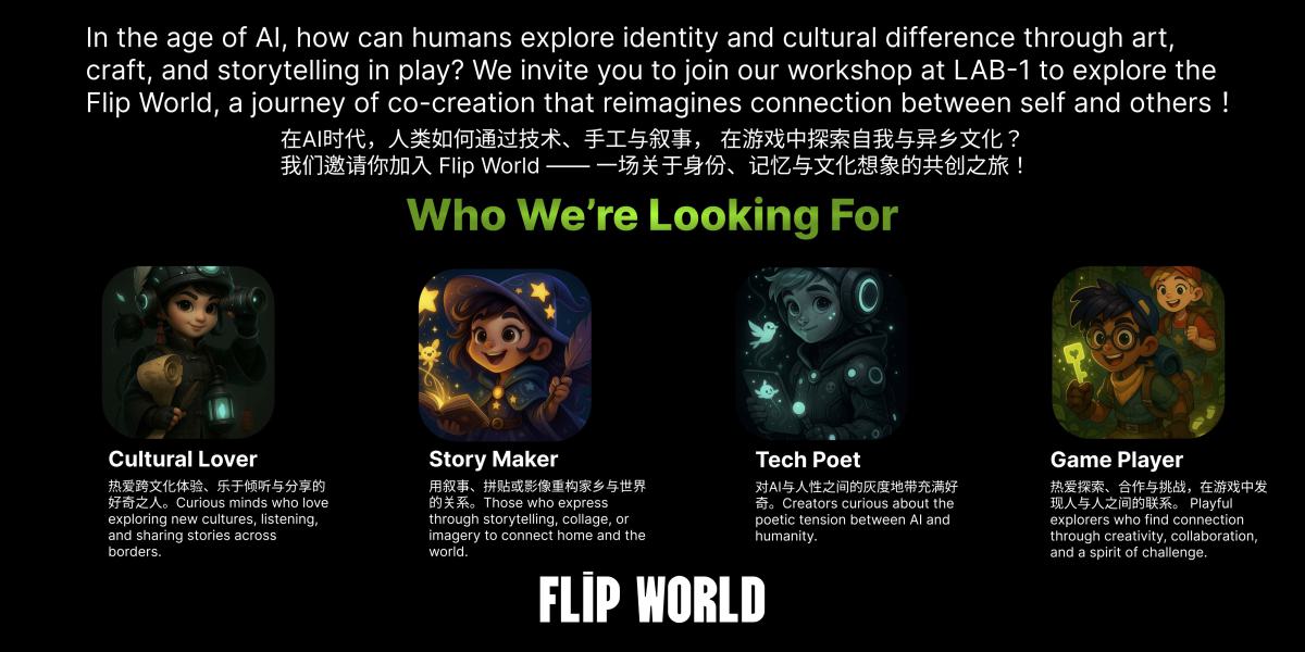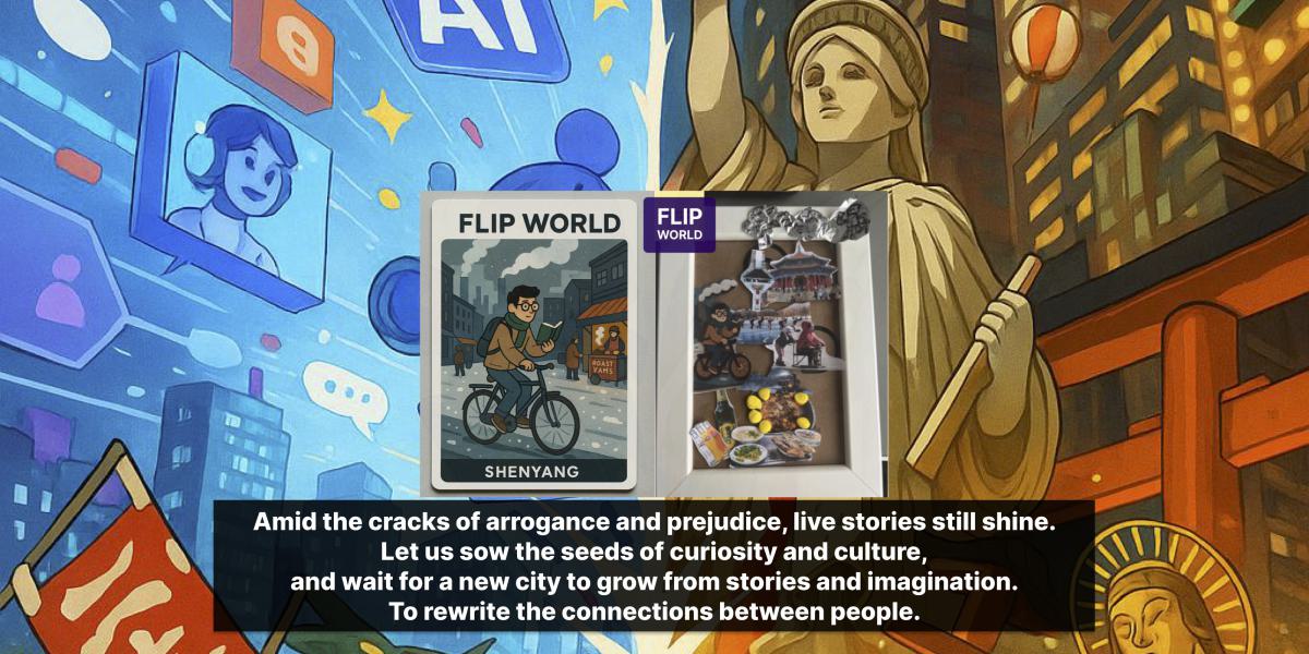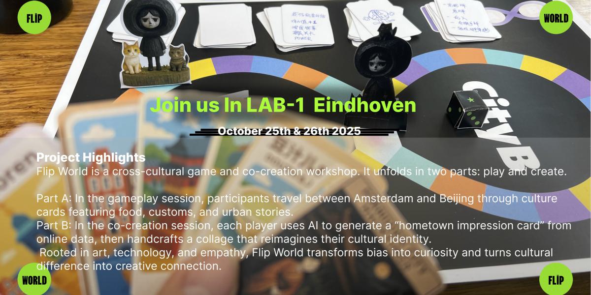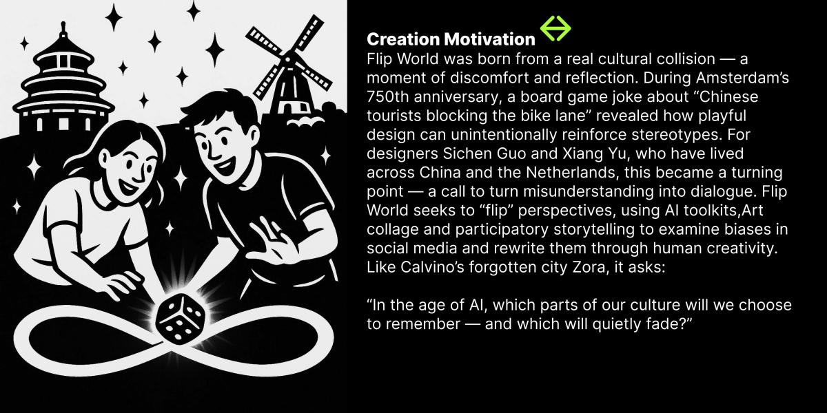 Flip World is geĂŻnitieerd door Sichen Guo en Xiang Yu, twee Chinese ontwerpers en designonderzoekers gevestigd in Nederland. Hun gezamenlijke praktijk verkent hoe kunst, AI en verhalen menselijke interactie, nieuwsgierigheid en crossculturele verkenning kunnen stimuleren.