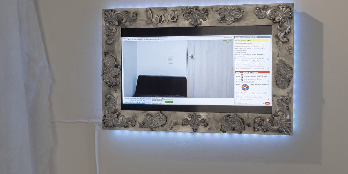 “Welcome to my room <3 (˶ᔔ ᔕ ᔔ˶) [329 tokens left]” by Misia ZesƂawska delves into the practice of webcam modelling, touching upon its spatial manifestations and poetics of improvised, DIY visual language of lust. Conditioned by constant technological growth and precarious economies, camrooms serve as remote stages for erotic, transactional performances, where their decor reveals a contemporary realm of digital intimacy - sensual yet deprived of tangible presence.